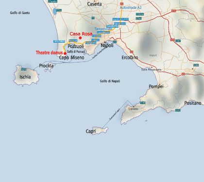 La villa Theatre domus è ubicata nel borgo di Capo Miseno (Bacoli), nei dintorni di Napoli. Pur vantando di una posizione centrale, è immersa in un contesto naturale-archeologico molto suggestivo; nell'area sovrastante un antico teatro romano con accesso esclusivo dalla villa e sbocco a mare, sulle pendici di una collinetta tufacea coperta da macchia mediterranea. |